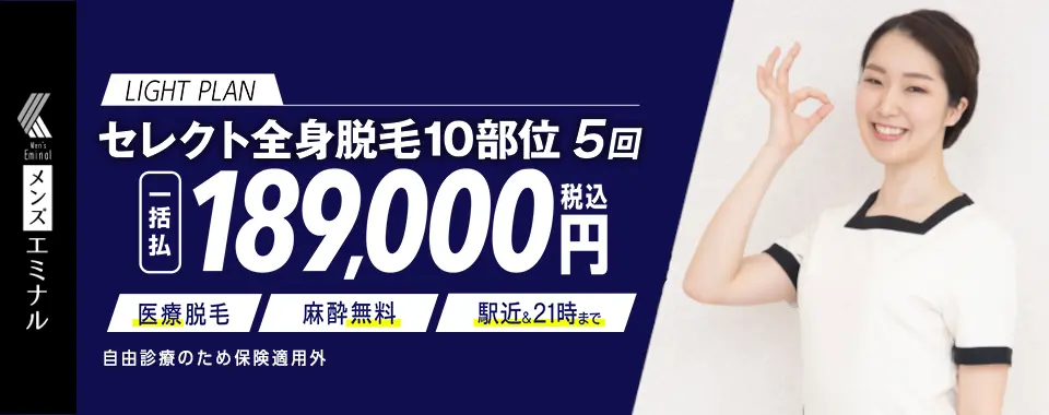 全国に50院以上を展開するメンズエミナル。リーズナブルな脱毛料金とオプション料金がほぼ無料なことで人気の大手メンズ専門医療脱毛クリニックです。