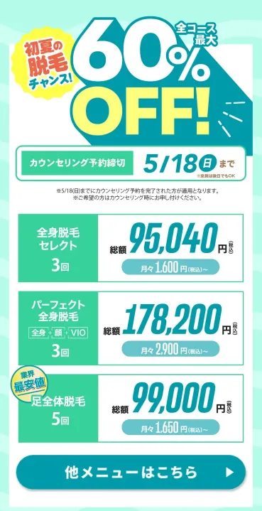 ▼詳しく見る |  |  | 95,700円 (平日割 86,130円) | 158,400円 (平日割 142,560円) | 297,000円 (平日割 267,300円) | 全部位 無料 ※セレクト脱毛除く | 全身脱毛が安い! 最大60%OFFキャンペーン 学割・乗換割・ペア割 最大5万円OFF併用OK 銀座・新宿院は21時まで | 3院 |